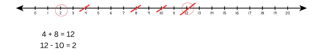 1. Player 1: Choose two numbers on a 0-20 number line and cross them out. Circle the sum or difference of the two numbers and write the equation. For example, your turn might look like this: